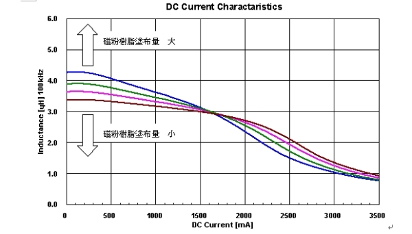 LQH55P_R0系列在卷線周圍全部涂有磁性樹脂,從而提高磁屏蔽,這樣做能夠獲得更低的直流電阻值。另外,由精密的涂層技術(shù)控制磁性樹脂的涂量,從而調(diào)節(jié)實(shí)際有效的μ并控制所需要的感值和直流偏置特性。圖5中表示了磁性樹脂涂量變化時(shí)的直流偏置特性。精密磁性樹脂涂層技術(shù)使較大電流時(shí)可維持最低限度的感值,以及減少初期感值低下等直流偏置特性可以得到自由控制。