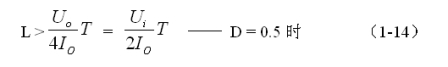 (1-13)和(1-14)式,就是計(jì)算串聯(lián)式開關(guān)電源儲能濾波電感L的公式(D = 0.5時(shí))。(1-13)和(1-14)式的計(jì)算結(jié)果,只給出了計(jì)算串聯(lián)式開關(guān)電源儲能濾波電感L的中間值,或平均值,對于極端情況可以在平均值的計(jì)算結(jié)果上再乘以一個(gè)大于1的系數(shù)。