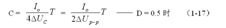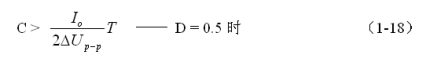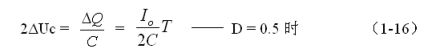 (1-17)和(1-18)式,就是計(jì)算串聯(lián)式開關(guān)電源儲能濾波電容的公式(D = 0.5時(shí))。式中:Io是流過負(fù)載的電流,T為控制開關(guān)K的工作周期,ΔUP-P為輸出電壓的波紋。電壓波紋ΔUP-P一般都取峰-峰值,所以電壓波紋正好等于電容器充電或放電時(shí)的電壓增量,即:ΔUP-P = 2ΔUc 。