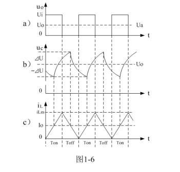 圖1-6是串聯(lián)式開關(guān)電源工作于臨界連續(xù)電流狀態(tài)時(shí),串聯(lián)式開關(guān)電源電路中各點(diǎn)電壓和電流的波形。圖1-6中,Ui為電源的輸入電壓,uo為控制開關(guān)K的輸出電壓,Uo為電源濾波輸出電壓,iL為流過儲能濾波電感電流,Io為流過負(fù)載的電流。圖1-6-a)是控制開關(guān)K輸出電壓的波形;圖1-6-b)是儲能濾波電容C的充、放電曲線圖;圖1-6-c)是流過儲能濾波電感電流iL的波形。當(dāng)串聯(lián)式開關(guān)電源工作于臨界連續(xù)電流狀態(tài)時(shí),控制開關(guān)K的占空比D等于0.5,流過負(fù)載的電流Io等于流過儲能濾波電感最大電流iLm的二分之一。