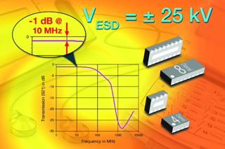 新款VEMI濾波器陣列的厚度只有0.6mm,可節(jié)省電路板空間,并為便攜式游戲機(jī)、PDA、智能手機(jī)和其他接收800MHz~2400MHz頻段RF信號(hào)的系統(tǒng)中的嵌入式攝像頭和LCD提供EMI濾波和ESD保護(hù)功能。VEMI陣列中的低通濾波器使低頻信號(hào)在通過時(shí)的衰減非常低,而將移動(dòng)通信系統(tǒng)的載波頻率這樣的高頻信號(hào)短路到地。
