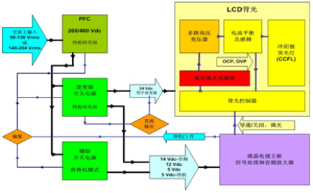 傳統(tǒng)液晶電視電源主要由交流-直流(AC-DC)轉(zhuǎn)換、直流-直流(DC-DC)轉(zhuǎn)換及高壓逆變器幾部分組成。AC-DC和DC-DC在同一塊電路板上,逆變器在另一塊電路板上,通常與液晶面板在一起。其中,AC-DC電源部分將市電110 Vac/220 Vac電壓進行整流、PFC和濾波,再轉(zhuǎn)換為200 V/400 V的直流高壓。由于傳統(tǒng)逆變器的輸入電壓要求為24 V,所以200 V/400 V 的PFC的輸出電壓要經(jīng)過降壓轉(zhuǎn)換,以產(chǎn)生多路輸出電壓,其中一路24 V電壓提供給逆變器,即再經(jīng)過直流-交流(DC-AC)轉(zhuǎn)換為超過1,000 V甚至達2,000 V的高壓,以便驅(qū)動液晶面板的CCFL背光燈。這種標(biāo)準(zhǔn)24 V逆變器液晶電視開關(guān)電源的功能框圖如圖1所示。