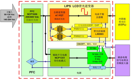 圖2:安森美半導(dǎo)體針對32英寸液晶電視的全橋高壓LIPS解決方案功能框圖。