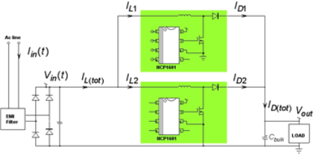 圖3:用兩顆NCP1601 PFC控制器實現(xiàn)交錯式PFC架構(gòu)的功能框圖。