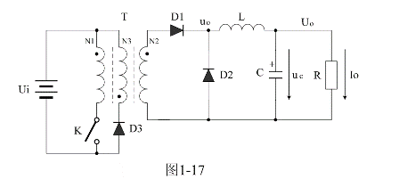 圖1-17是正激式變壓器開關(guān)電源的簡單工作原理圖,圖1-17中Ui是開關(guān)電源的輸入電壓,T是開關(guān)變壓器,K是控制開關(guān),L是儲能濾波電感,C是儲能濾波電容,D2是續(xù)流二極管,D3是削反峰二極管,R是負(fù)載電阻。