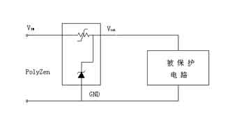 PolyZenTM元件器件是由精密齊納二極管和聚合物正溫度系數(shù)(PPTC)元件組合而成的集成電路。它是用于防止感應尖峰電壓、瞬間高電壓、錯用電源適配器對電路產生過壓、過流危害的保護器件,內部結構如圖14所示。其典型應用電路如圖15所示。在圖15中,RLOAD為被保護的下游電路。