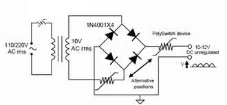 PolySwitchTM元件在便攜式電子產品適配器(外接電源)中的過流保護如圖6所示。圖中結構用了兩個PolySwitchTM器件,可防止短路時損壞適配器。
