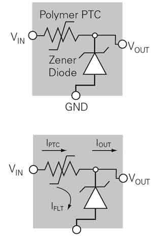 在正常工作時,VIN輸入電壓高于齊納二極管的擊穿電壓VZ,有IFLT電流經(jīng)齊納二極管到地,VOUT輸出穩(wěn)定的電壓。有不正常的過壓輸入VIN 時,則齊納二極管的IFLT會產生過流,當器件上有過流時,其電阻由低阻態(tài)瞬變到高阻態(tài),使在其上的壓降大增,VOUT輸出基本不變,而流過齊納二極管的電流IFLT反而減小,如圖16所示。器件上電壓降的增大既保護了齊納二極管,又保護了下游的電路。另外,若被保護的下游電路中存在有局部短路或短路故障時,IOUT會增加,PPTC元件由低阻態(tài)變成高阻態(tài),可使電路得到過流保護。