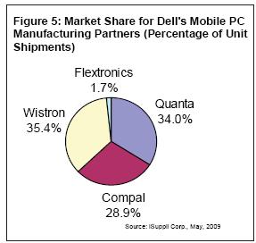 通常,Dell將個(gè)人移動(dòng)PC制造交予Wistron,將企業(yè)移動(dòng)PC制造交予Compal,Quanta則兩者兼有。圖中的數(shù)據(jù)顯示2008年Wistron為Dell完全制造的移動(dòng)PC的份額超過(guò)了50%。