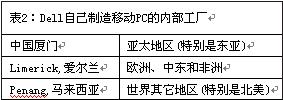 在后端,Dell采用復(fù)雜的按客戶訂單進(jìn)行配置(CTO)的營(yíng)運(yùn)模式來(lái)支持這種產(chǎn)品定制。對(duì)移動(dòng)PC,Dell有三個(gè)內(nèi)部制造工廠來(lái)支持它所服務(wù)的主要終端市場(chǎng)。表2所示為Dell自己制造移動(dòng)PC的內(nèi)部工廠。