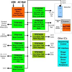 在這個解決方案中,就算鋰離子電池下降至3.3V左右,在100%負(fù)載周期模式下工作的高效率TPS62200降壓轉(zhuǎn)換器仍能提供3.3V的I/O電壓。上述所有零件都采用SOT-23封裝,除了bq24020電池充電組件、TPS61020升壓轉(zhuǎn)換器以及TPS61042白光二極管驅(qū)動組件之外,它們是采用3×3平方厘米的QFN封裝。TPS61040和TPS61042還內(nèi)建上端FET晶體管,每顆組件只需要一個外接二極管。bq24020、TPS622xx、TPS61020和線性穩(wěn)壓器組件全都內(nèi)建FET晶體管,功率放大器和中央處理器電源采用的動態(tài)電壓調(diào)整技術(shù)可以提高每顆零件的效率,進(jìn)而協(xié)助降低功耗。