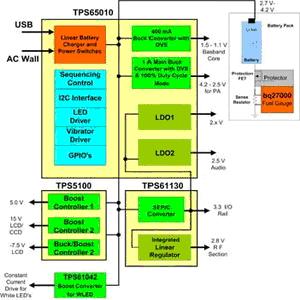 在此解決方案中,3.3VI/O電源是由SEPIC轉(zhuǎn)換器提供,它讓應(yīng)用系統(tǒng)能充份利用鋰離子電池電力,直到電池電壓降至最低水平(大約2.7V)。和離散解決方案一樣,穩(wěn)壓器輸出也來自3.3V輸入電源,以便提高工作效率。TPS65010采用48只接腳QFN封裝,這些組件都內(nèi)建FET晶體管。TPS61130SEPIC轉(zhuǎn)換器采用4×4平方厘米QFN封裝,并且內(nèi)建FET晶體管,最高達(dá)到90%以上效率,TPS5100則是三通道輸出控制器,專門用來提供電源給顯示器。功率放大器和中央處理器電源使用的動態(tài)電壓調(diào)整技術(shù)可以改善每顆零件的效率,進(jìn)而協(xié)助降低功耗。