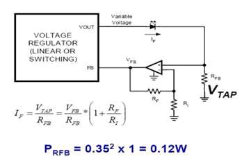 考慮運(yùn)算放大器本身的功耗,RFB及其附屬電路的功耗大約為1WLED功率的12%。這樣就能在確保LED獲得恒流供電的同時,將RFB的功耗降低到可以接受的水平,從而使LED兩端的電壓盡可能大,流經(jīng)的電流也盡可能大。國家半導(dǎo)體按照這個原理工作的穩(wěn)壓器有LM2736和LM2734。