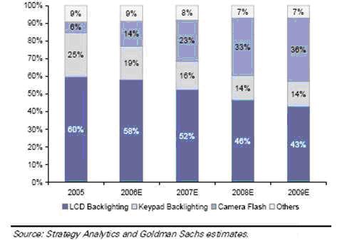 可拍照手機有取代傳統(tǒng)中低端數(shù)碼相機的趨勢,并且消費者期望能夠在低光照亮度的條件下拍攝高質(zhì)量的照片,因而采用Flash LED作為閃光燈是提高數(shù)碼相機性能的重要措施。Flash LED的光學特性決定它既可以作為拍照的閃光應用,也可以用于視頻拍攝時補光,甚至是用于照明的電筒應用。因此Flash LED在手機中的應用將會越來越普遍,表1為Flash LED作為閃光燈在手機LED應用中的比例走勢。