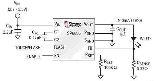 3)SP6686、SP6685和SP7685系列產(chǎn)品可提供300mA至1.2A閃光電流,適用于200萬像素及以上相機應用,圖3為該系列產(chǎn)品的典型應用電路: