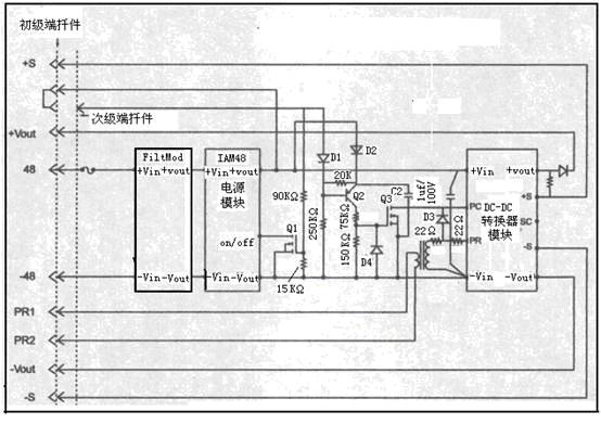 當(dāng)48V母線關(guān)斷時(shí),母線上的保持電容可通過并聯(lián)開關(guān)迅速放電。除了通斷控制功能外,IAM48模塊還具有限制浪捅電流的功能,并且與FiltMod模塊或EMI濾波器模塊配合,還可完成瞬變過電壓保護(hù).通信設(shè)備中為了滿足EMC{電磁兼容)標(biāo)準(zhǔn),通常都采用IAM48和FitMod模塊(見圖1中FitMod模塊與IAM48模塊的連接)。在通信設(shè)備中,都要求電源模塊具有熱插拔功能,因此應(yīng)選用lAM48電源模塊或其他可限制浪涌電流的模塊。