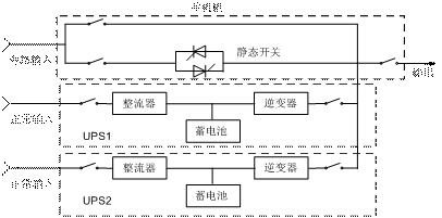 目前,為了提高UPS的可靠性,主要采用主從結(jié)構(gòu)的UPS“1+1”并聯(lián)備份,如圖4所示。雖然這樣在一定程度上提高了供電可靠性,但是不便于離線維護(hù)、擴(kuò)容,同時(shí)也造成設(shè)備利用不充分、缺乏靈活性等方面的缺陷。對(duì)于一些不能夠停電的用戶(例如醫(yī)療、銀行、金融、通信、國防等行業(yè)),UPS“1+1”并聯(lián)備份,還是存在很大的電力系統(tǒng)癱瘓隱患。