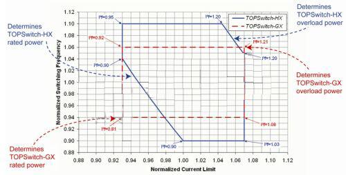 TOPSwitch-HX已解決了上述難題。TOPSwitch-HX引入額外的電路,并在最終測(cè)試中采用參數(shù)調(diào)整技術(shù),以控制開關(guān)頻率與流限值平方的乘積的最大值和最小值,這在數(shù)據(jù)手冊(cè)中用一個(gè)新的參數(shù)來表征,即功率因數(shù)(I2f)。