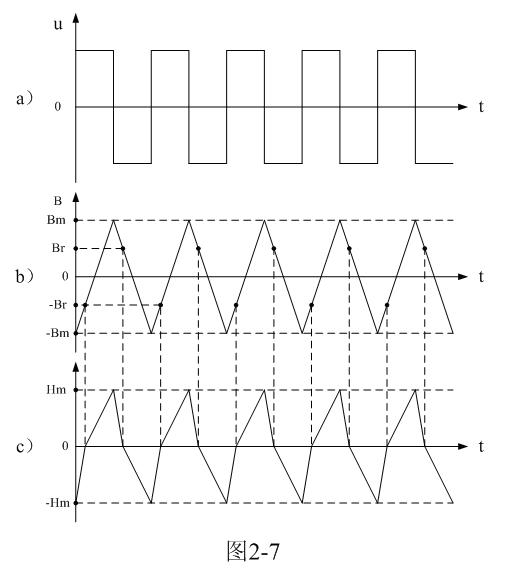 在正常情況下,當(dāng)有交流脈沖電壓輸入時,磁通密度B就會沿著理想磁化曲線d-a,由負(fù)最大值-Bm至正最大值Bm,然后,又由正最大值Bm至負(fù)最大值-Bm,來回地變化;對應(yīng)磁場強度H也是沿著理想磁化曲線d-a由負(fù)最大值-Hm至正最大值Hm,然后,又由正最大值Hm至負(fù)最大值-Hm,來回變化。
