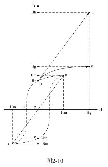 但當(dāng)變壓器鐵芯中的磁化過程是從上次剩余磁通密度Br的位置開始時,上面所分析的理想磁化過程將要被破壞,磁通密度B不會再沿著理想磁化曲線d-a進(jìn)行,而是沿著另一條新的等效磁化曲線進(jìn)行;這條新的等效磁化曲線應(yīng)該與原理想磁化曲線d-a平行,并且經(jīng)過Br點,圖2-10中虛線b-h就是這條新的等效磁化曲線的一部分。這里只畫出新等效磁化曲線的一半,另一半在圖2-10中沒有畫出。