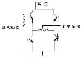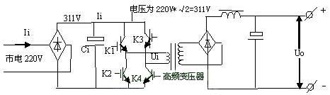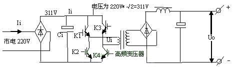 由電路可以看出,市電經(jīng)整流濾波后變?yōu)?11V高壓,經(jīng)K1~K4功率開關(guān)管有序工作后,變?yōu)槊}沖信號(hào)加至高頻變壓器的初級(jí),脈沖的高度始終為311V。當(dāng)K1,K4開通時(shí),311V高壓電流經(jīng)K1正向流入主變壓器初級(jí),經(jīng)K4流出,在變壓器初級(jí)形成一個(gè)正向脈沖。