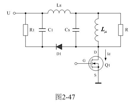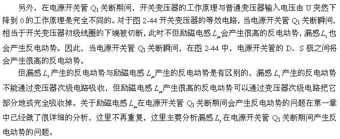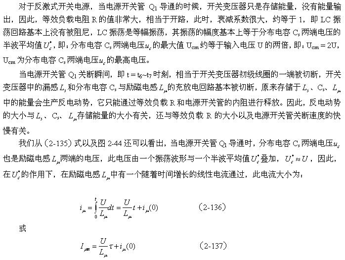 在圖2-46中,Cs1、Cs2都是分布電容,它們對于漏感 來說,既可以產(chǎn)生串聯(lián)振蕩,又可以產(chǎn)生并聯(lián)振蕩。在電源開關(guān)管Q1導(dǎo)通瞬間,漏感與分布電容主要是產(chǎn)生串聯(lián)振蕩,因?yàn)檩斎腚妷洪_始向串聯(lián)振蕩回路提供能量;在電源開關(guān)管Q1關(guān)斷瞬間,漏感與分布電容主要是產(chǎn)生并聯(lián)振蕩,因?yàn)槁└?必須要通過并聯(lián)回路釋放能量。在實(shí)際應(yīng)用中,漏感相對于勵磁電感 來說很小,因此如果不考慮漏感的作用,完全可以把Cs1、Cs2看成是一個(gè)分布電容。