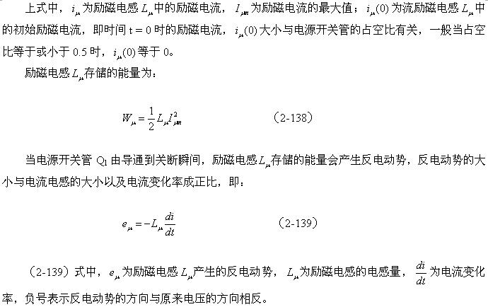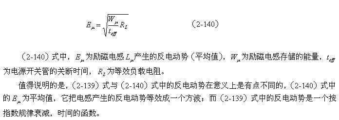 (2-140)式對于計(jì)算漏感 產(chǎn)生的反電動勢或其它電感產(chǎn)生的反電動勢同樣有效。漏感 中存儲的能量可根據(jù)(2-138)式求得;而流過漏感 的電流,對于反激式開關(guān)電源:可認(rèn)為與勵磁電流的大小基本相等,因?yàn)?,在反激式開關(guān)電源中,等效負(fù)載電阻等于無限大;對于正激式開關(guān)電源:可認(rèn)為與流過等效負(fù)載電阻的電流大小基本相等,因?yàn)?,在正激式開關(guān)電源中,勵磁電流相對于流過等效負(fù)載電阻的電流,很小。