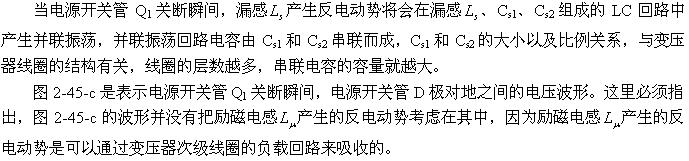 圖2-47中的D1、R1、C1是抑制漏感以及勵磁電感產(chǎn)生反電動勢和振鈴電壓幅度的有效電路。當(dāng)變壓器初級漏感以及勵磁電感產(chǎn)生反電動勢時(shí),反電動勢通過二極管D1對電容器C1進(jìn)行充電,相當(dāng)于電容器把反電動勢的能量吸收掉,從而降低了反電動勢和振鈴電壓的幅度。