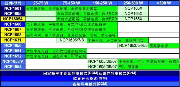 安森美半導(dǎo)體提供豐富PFC控制器選擇,如NCP1601/5/6/7/8、NCP1631、NCP1650/1/2/3/4等,涵蓋上述不同工作模式,優(yōu)化用于不同功率的應(yīng)用,見表1。如NCP1606/7/8采用CrM工作模式,適合于功率通常低于300W的中等功率應(yīng)用,如電子鎮(zhèn)流器、液晶電視、等離子電視、臺式計算機(jī)和交流適配器等。最新推出的NCP1654均工作在CCM模式,適用于功率大于200W以上的場合。NCP1654的前身NCP1653推出幾年來已經(jīng)獲得了極大的成功,廣泛應(yīng)用于臺式計算機(jī),開放式電源等領(lǐng)域。特別是在液晶電視和等離子電視中更是占據(jù)了絕大多數(shù)的市場份額。
