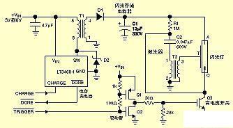閃光電容器充電器基本上是一種具有某些特殊能力的變壓器耦合升壓轉(zhuǎn)換器。當其“充電”控制線為高電位時,穩(wěn)壓器同步內(nèi)部功率開關(guān),使升壓變壓器產(chǎn)生高電壓脈沖。然后,這些脈沖再經(jīng)整流和濾波,產(chǎn)生300V的直流輸出,其轉(zhuǎn)換效率高達80%。