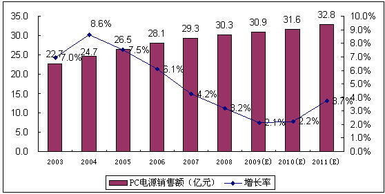 - 2009年中國PC電源市場的增長率將進一步下降,銷售規(guī)模同比增長3.8%,銷售額同比增長2.1%