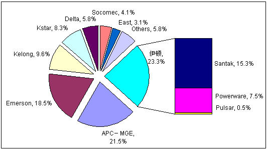 2006年以來,中國UPS市場開始了廠商之間一系列的并購整合,競爭格局開始重新洗牌,直到2008年,新的格局才基本確立。目前,市場第一陣營被國際三巨頭伊頓、施耐德、艾默生占據(jù),市場份額達到63.3%。而科華、科士達這兩個國內(nèi)自主品牌廠商也憑借良好的發(fā)展?fàn)顟B(tài)和合理的市場策略脫穎而出,躋身UPS市場的第二陣營。