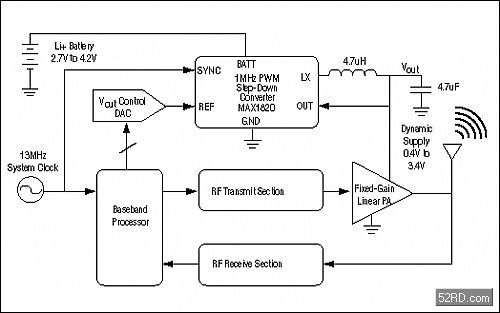 開關(guān)型調(diào)節(jié)器改善發(fā)送效率的基本原理是,通過動態(tài)調(diào)節(jié)功放的供電電壓,使其剛好能夠滿足功放中射頻信號的幅度要求(見圖1)。采用開關(guān)調(diào)節(jié)器高效率地實現(xiàn)這種調(diào)節(jié),在峰值發(fā)送功率以外的任何條件下,都可大幅度地節(jié)省電池功率。因為峰值功率只有在遠離基站和數(shù)據(jù)傳送時需要,總體來講,這種方案的省電效果是非常顯著的。