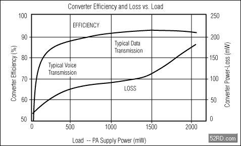 在很寬的負載范圍內(nèi)具有高效率—沒有高效率,采用開關(guān)型調(diào)節(jié)器就失去了意義,因此,高效率和省電是MAX1820的主導(dǎo)設(shè)計思想(見圖3)。傳送數(shù)據(jù)時(約500mW至2040mW),MAX1820內(nèi)部的低導(dǎo)通電阻(0.15Ω)PFET功率開關(guān)可以提供高達93%的效率。傳送話音時(約12mW至500mW),MAX1820內(nèi)部的0.2ΩNFET同步整流器和3.3mA的低工作電流(強制PWM模式)使轉(zhuǎn)換效率達到85%。85%的效率聽起來不算太高,但對于一個工作在1MHz恒定開關(guān)頻率和很輕負載的轉(zhuǎn)換器來講確非易事,正如圖3所示,轉(zhuǎn)換器具有極低的功率損耗。這要歸功于優(yōu)秀的設(shè)計和亞微米工藝的采用,這種工藝能夠在給定的FET導(dǎo)通電阻下獲得更低的柵極電容。