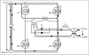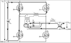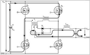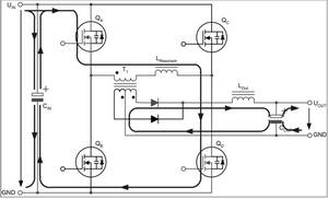 兩個互為對角的全橋開關不是同時驅動,而是通過相移的方法在啟動命令之間引入預定義的短期延遲。這種延遲由控制電路的電壓回路進行調節(jié),從而在兩個驅動信號之間產(chǎn)生相移。這種相移技術的特殊之處在于,它可啟動兩個與變壓器串聯(lián)的開關,而變壓器的電壓卻為零。