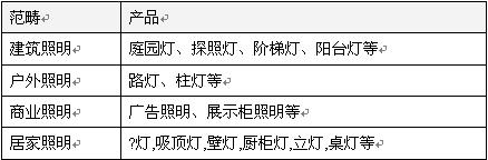 隨著技術(shù)的改善,LED燈具的用途已由過(guò)去數(shù)十年單純應(yīng)用在指示燈、信號(hào)燈等,逐步使用在手機(jī)背光源、車(chē)內(nèi)用照明、煞車(chē)燈、LCD電視、手提電腦背光源等輔助照明;而在近兩年內(nèi),其開(kāi)始成為主照明系統(tǒng),所應(yīng)用的范疇可涵蓋建筑、戶(hù)外、商業(yè)、及居家等,產(chǎn)品則分別有: