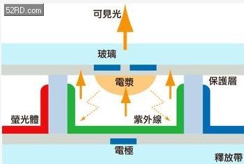 更簡單說,PDP即是由成千上萬的微小霓虹燈所組成,然其顯示原理仍舊是倚賴電弧放電,放電必須要有較高的電極電壓(如同打雷),這也是PDP較耗電的一大主因。