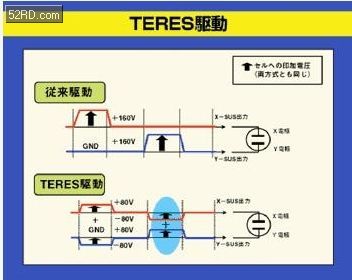 為了降低PDP的用電,Fujitsu-Hitachi(富士通日立,富士通也是PDP的發(fā)創(chuàng)業(yè)者)提出了TERES(TechnologyofReciprocalSustainer)技術,將X、Y電極的電位交替由「0V:160V、160V:0V」改成「+80V:-80V、-80V:+80V」的方式,同時為彌補驅動電壓的改變而將交替頻率提升一倍。