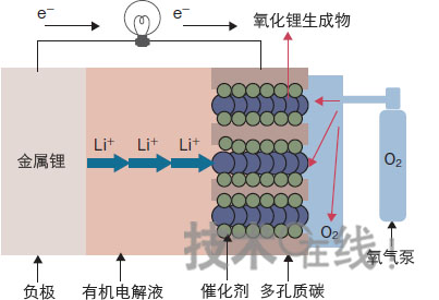 圖7:原來的鋰-空氣(氧)電池的原理圖顯藍(lán)色的反應(yīng)生成物會阻塞催化劑