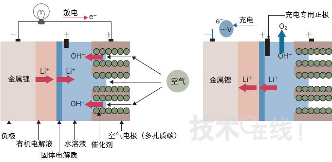 在該電池中,由放電反應(yīng)生成的并非是固體的Li2O,而是容易溶解在水性電解液中的LiOH(氫氧化鋰)。因此,氧化鋰在空氣電極堆積后,不會導(dǎo)致工作停止。另外,水及氮等也不會穿過固體電解質(zhì)的隔壁,因此不存在與負(fù)極的鋰金屬發(fā)生反應(yīng)的危險(xiǎn)。而且,在充電時(shí),如果配置充電專用的正極,還可防止充導(dǎo)電致空氣電極的腐蝕和老化。
