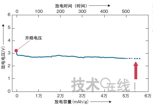 圖9:新結(jié)構(gòu)鋰-空氣電池的長時(shí)間連續(xù)放電曲線放電容量約為5萬mAh/g,是比原來的鋰-空氣電池高一位數(shù)。