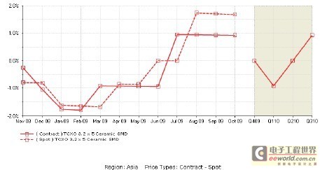 10月份振蕩器的平均現(xiàn)貨市場(chǎng)價(jià)格是1.42美元,合同價(jià)格是1.17美元。有一些跡象表明2010年第一季度需求將放緩,而供應(yīng)將會(huì)改善。這種趨勢(shì)可能使該市場(chǎng)恢復(fù)供需平衡。第四季度振蕩器的合同價(jià)格預(yù)計(jì)將持穩(wěn),2010年第一季度下降0.2%。