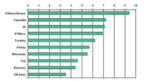 據(jù)2007年在美國舉辦的APEC(應用功率電子會議)會議給出的有關數(shù)據(jù)指出,全球電源市場按品牌劃分如圖1所示(資料來源:2007APEC會議IMS調(diào)研機構給出的有關數(shù)據(jù)(2005年全球電源市場按品牌所占的市場份額%劃分))。