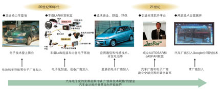 近10年來,從引進CAN車載LAN接口規(guī)格到標準化團體的建立,汽車電子化不斷前進,這表明汽車工業(yè)正從垂直整合的封閉世界走向水平分工的開放世界。2008年在紐約召開的全球第15屆ITS(智能交通系統(tǒng))大會上,通用汽車的展臺上出現(xiàn)了Google公司的產(chǎn)品,不少歐洲公司也開始提供Google的地圖服務(wù),日產(chǎn)公司也與Google Maps牽手,提供目的地導航服務(wù)。汽車業(yè)界的封閉堅冰已經(jīng)打破,開放匯為潮流。