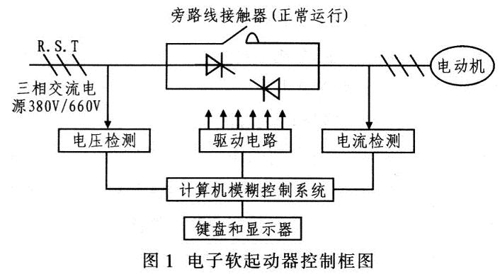 軟起動有磁控降壓軟起動器和電子軟起動器。其中,磁控降壓軟起動采用控磁限幅調(diào)壓方式減壓調(diào)控電動機起動時的電壓,實質(zhì)就是電抗器降壓起動。電子軟起動器有晶閘管調(diào)壓軟起動和變頻器調(diào)速軟起動。晶閘管調(diào)壓軟起動器的主回路采用6只晶閘管兩兩反向并聯(lián)組成的調(diào)壓電路,并焊接于電動機的三相供電線路。當(dāng)起動器的微機控制系統(tǒng)接收到起動指令后進行有關(guān)計算。輸出晶閘管的觸發(fā)信號,通過控制晶閘管的導(dǎo)通角起動器按所設(shè)定的模式調(diào)節(jié)輸出電壓,從而控制電動機的起動。當(dāng)電動機起動完成后,起動器吸合旁路線接觸器,使晶閘管短路,電動機直接投入電網(wǎng)運行,避免不必要的電能損耗。圖1為電子軟起動器控制框圖。