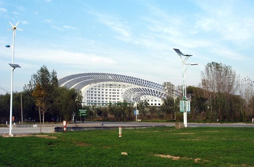 “日月壇-微排大廈”是2010年第四屆世界太陽城大會的主會場。它把太陽能綜合利用技術與建筑節(jié)能技術相結合,不但完善了太陽能應用技術標準體系、研發(fā)了一批具有自主知識產(chǎn)權的太陽能系列產(chǎn)品,還為太陽能規(guī)模化推廣應用提供了寶貴的技術支持,整體突破了普通建筑常規(guī)能源消耗巨大的瓶頸,綜合應用了多項太陽能新技術,如吊頂輻射采暖制冷、光伏發(fā)電、光電遮陽、游泳池節(jié)水、雨水收集、中水處理系統(tǒng)、滯水層跨季節(jié)蓄能等技術,使多項節(jié)能技術發(fā)揮應用到極致。