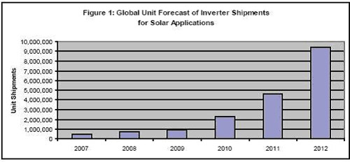 太陽能系統(tǒng)廣闊的應(yīng)用需要使用更多的逆變器,這為眾多從事電源IC和元器件廠商帶來巨大的機(jī)會。iSuppli公司預(yù)計(jì),2012年全球用于太陽能系統(tǒng)的逆變器出貨量將從2008年時(shí)的723,329個(gè)增長到950萬個(gè),如圖1所示。
