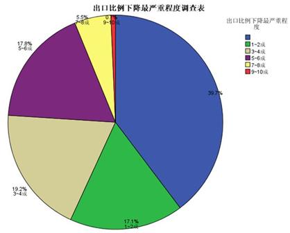 [page](二)出口下降最嚴重程度5-6成者比重最大,目前為止基本上已大部分恢復金融風暴,全球經(jīng)濟重創(chuàng),對出口為主的企業(yè)影響最為慘重,尤其是對于以出口為導向的我國行業(yè)企業(yè),損失慘重。數(shù)據(jù)顯示,受金融危機影響,出口比例下降最嚴重程度5-6成者比重最大,占17.8%,下降1-2成者比例也不低,占17.1%(如下圖:出口比例下降最嚴重程度調(diào)查表。備注:藍色部分39.7%比例為單一內(nèi)銷型企業(yè))。
