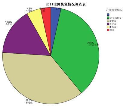 目前,就出口比例恢復情況來看,雖然僅35.6%企業(yè)出口已全部恢復,但恢復8-9成以上者占了72.6%的比重,可見,出口受影響已大部分恢復。