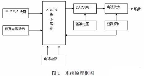 本系統(tǒng)是以AT89S51 單片機(jī)為核心控制器,具有電壓可預(yù)置、可步進(jìn)調(diào)整、輸出的電 壓信號(hào)和預(yù)置的電壓信號(hào)可同時(shí)顯示的數(shù)控直流電源,其硬件原理方框圖如圖1 所示。系統(tǒng) 由AT889S51 控制電路、鍵盤(pán)電路、電源電路、D/A 電路、功放電路、短路保護(hù)及報(bào)警電路、 穩(wěn)壓輸出電路、LED 顯示電路八部分組成。系統(tǒng)通過(guò)“開(kāi)關(guān)”、“+”、“-”三個(gè)按鍵來(lái)控制預(yù)置電壓的升降,并通過(guò)數(shù)碼管顯示。AT89S51 單片機(jī)送出相應(yīng)的數(shù)字信號(hào),在D/A 轉(zhuǎn)換之 后輸出電流,經(jīng)集成運(yùn)放LM358 轉(zhuǎn)換、三極管放大、RC 網(wǎng)絡(luò)濾波,最終穩(wěn)定。同時(shí)由LED 數(shù)碼管顯示輸出電壓;由數(shù)字電壓表測(cè)量實(shí)測(cè)值。